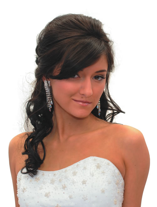 A wedding calls for a little something extra up top. This modified bouffant (created by the architects of Sarah Palin’s famous bouffant) allows length and height at the same time, and gets some hair off the face to highlight neck and shoulders. Bangs pushed to the side counteract a bump on top to keep the look from prom territory. This style would work with glossy, straight hair as well.