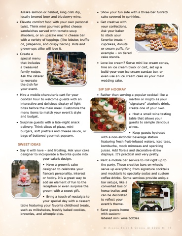 %uf098 A l a s k a B r i d e & G r o o m %uf099 2026 %uf098 1 1 Alaska salmon or halibut, king crab dip, locally brewed beer and blueberry wine. %u2022 Elevate comfort food with your own personal twist. Think mini gourmet grilled cheese sandwiches served with tomato soup shooters, or an upscale mac %u2018n cheese bar with a variety of toppings (like lobster, truffle oil, jalape%u00f1os, and crispy bacon). Kids and grown-ups alike will love it.%u2022 Create a special menu that includes a treasured family recipe. Ask the caterer to recreate the dish for your event.%u2022 Hire a mobile charcuterie cart for your cocktail hour to welcome guests with an interactive and delicious display of light bites before the main meal. Customize the menu items to match your event%u2019s style and budget.%u2022 Surprise guests with a late-night snack delivery. Think slices of pizza, mini burgers, soft pretzels and cheese sauce, or bags of buttered gourmet popcorn.SWEET IDEAS%u2022 Say it with love %u2013 and frosting. Ask your cake designer to incorporate a favorite quote into your cake%u2019s design.%u2022 Have a groom%u2019s cake designed to celebrate your fiance%u2019s personality, interest or hobby. It%u2019s a great way to add an element of fun to the reception or even surprise the groom with a sweet gift.%u2022 Bring a touch of nostalgia to your special day with a dessert table featuring your favorite childhood treats, such as milkshakes, freshly baked cookies, brownies, and whoopie pies.%u2022 Show your fun side with a three-tier funfetti cake covered in sprinkles.%u2022 Get creative with your confections. Ask your baker to stack your favorite treats %u2013 cupcakes, donuts or cream puffs, for example %u2013 on tiered cake stands.%u2022 Love ice cream? Serve mini ice cream cones, hire an ice cream truck or cart, set up a build-your-own ice cream sundae bar, or even use an ice cream cake as your main wedding cake.SIP SIP HOORAY%u2022 Rather than serving a popular cocktail like a martini or mojito as your %u201csignature%u201d alcoholic drink, create one of your own.%u2022 Host a small wine tasting table that allows your guests to sample delicious wines.%u2022 Keep guests hydrated with a non-alcoholic beverage station featuring fresh fruit-infused waters, iced teas, kombucha, mock mimosas and sparkling juices. Add florals and decorative-straw displays. It%u2019s practical and very pretty.%u2022 Rent a mobile bar service to roll right up to the party. These creative bars on wheels serve up everything from signature cocktails and mocktails to specialty sodas and custom coffee drinks. Some services provide unique bar setups, like a converted bus or horse trailer, and can be decorated to reflect your event%u2019s theme.%u2022 Send guests home with customlabeled mini wine bottles.Sassy Pour Mobile Bartenders