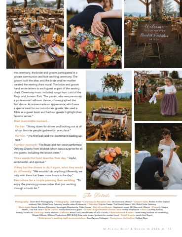 %uf098 A l a s k a B r i d e & G r o o m %uf099 2026 %uf098 1 5 The DetailsPhotography: Silver Birch Photography %u2022 Videography: Josh Vassar %u2022 Ceremony & Reception site: AK Diamond J Ranch %u2022 Dessert table: Bride%u2019s mother (baked cookies); Mel, Bridal Suite Catering (smaller cakes & desserts) %u2022 Catering: Virginia Fraase, The Hearth Eatery; Mel, Bridal Suite Catering%u2022 Beverages: Homer Brewing Company; Sweetgale Meadworks; Cider House %u2022 Day-of coordinator: Stephanie Jones, AK Diamond J Ranch %u2022 Flowers: Kasara Bertels, The Teal Door %u2022 Bride%u2019s dress: Natalia Romanova gown %u2022 Groom%u2019s & groomsmen%u2019s formal wear: Men%u2019s Wearhouse %u2022 Hair: Courtney Barlow, Beauty Travels AK %u2022 Makeup: Kierra Manion %u2022 Officiant: Brian Cook, Head Pastor of ACF Church; %u2022 Entertainment & music: Daniel Perry (violinist for ceremony); Megan Killoran, Killoran Productions (MC & DJ); Silas Luke Jones, (guitarist for cocktail hour) %u2022 Bridal brunch: Land%u2019s End Resort %u2022 Bride/groom%u2019s wedding night accommodations: Bear Canyon Cottages %u2022 Honeymoon destination: Halibut Covethe ceremony, the bride and groom participated in a private communion and foot washing ceremony. The groom built the altar, and the bride and her mother created the seating chart mural. The bride and groom hand wrote letters to each guest as part of the seating chart. Ceremony music included songs from Lord of the Rings and Jurassic Park. The groom, who was previously a professional ballroom dancer, choreographed the first dance. A moose made an appearance, which was a special treat for our out-of-state guests. We used a Bible as a guest book and had our guests highlight their favorite verses.%u201dMost memorable moment%u2026For her: %u201cSitting down for dinner and looking out at all of our favorite people gathered in one place.%u201dFor him: %u201cThe first look and the excitement leading up to it.%u201dFunniest moment: %u201cThe bride and her sister performed Defying Gravity from Wicked, which was a surprise for all the guests, including the bride%u2019s sister.%u201dThree words that best describe their day: %u201cJoyful, sentimental, and spiritual.%u201dIf they had the chance to do it again, what they would do differently: %u201cWe wouldn%u2019t do anything differently, we only wish there had been more hours in the day.%u201dBest advice for a couple planning their wedding: %u201cTo enjoy the planning process rather than just working through a to-do list.%u201d