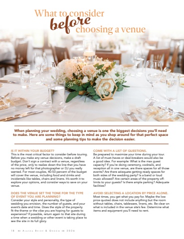 18 %uf098 A l a s k a B r i d e & G r o o m %uf099 2026What to considerWhen planning your wedding, choosing a venue is one the biggest decisions you%u2019ll need to make. Here are some things to keep in mind as you shop around for that perfect space and some planning tips to make the decision easier.IS IT WITHIN YOUR BUDGET?This is the most critical factor to consider before touring. Before you make any venue decisions, make a draft budget. Don%u2019t sign a contract with a venue, regardless of the price, only to realize down the line that you have no money left for that photographer or DJ you really wanted. For most couples, 40-50 percent of the budget will cover the venue, including food and drinks and incidentals like tables, chairs and linens. It%u2019s worth it to explore your options, and consider ways to save on your venue. DOES THE VENUE SET THE TONE FOR THE TYPEOF EVENT YOU ARE PLANNING?Consider your style and personality, the type of wedding you envision, the number of guests, and your event%u2019s date and time. Does the style of the property fit the theme or the vibe you are hoping for guests to experience? If possible, return again to that site during a time when a wedding or other event is taking place to see the site in its full glory.COME WITH A LIST OF QUESTIONS.Be prepared to maximize your time during your tour. A list of must%u2013haves or deal-breakers would also be a good idea. For example: What is the max guest capacity? If you%u2019re doing ceremony, cocktails, and reception all in one venue, are there spaces for all those events? Are there adequate getting-ready spaces for both sides of the wedding party? Is a band or loud music allowed? Are certain areas of the property offlimits to your guests? Is there ample parking? Adequate facilities?AVOID SELECTING A LOCATION BY PRICE ALONE.Most times, you get what you pay for. Maybe the low price quoted does not include anything but the room without tables, chairs, tableware, linens, etc. Be clear on what is included in the venue site%u2019s fee. Determine what items and equipment you%u2019ll need to rent. before choosing a venue