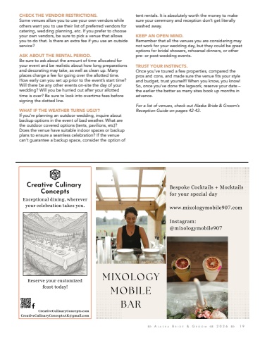 %uf098 A l a s k a B r i d e & G r o o m %uf099 2026 %uf098 1 9 CHECK THE VENDOR RESTRICTIONS.Some venues allow you to use your own vendors while others want you to use their list of preferred vendors for catering, wedding planning, etc. If you prefer to choose your own vendors, be sure to pick a venue that allows you to do that. Is there an extra fee if you use an outside service?ASK ABOUT THE RENTAL PERIOD.Be sure to ask about the amount of time allocated for your event and be realistic about how long preparations and decorating may take, as well as clean up. Many places charge a fee for going over the allotted time. How early can you set up prior to the event%u2019s start time? Will there be any other events on-site the day of your wedding? Will you be hurried out after your allotted time is over? Be sure to look into overtime fees before signing the dotted line.WHAT IF THE WEATHER TURNS UGLY?If you%u2019re planning an outdoor wedding, inquire about backup options in the event of bad weather. What are the outdoor covered options (tents, pavilions, etc)? Does the venue have suitable indoor spaces or backup plans to ensure a seamless celebration? If the venue can%u2019t guarantee a backup space, consider the option of tent rentals. It is absolutely worth the money to make sure your ceremony and reception don%u2019t get literally washed away.KEEP AN OPEN MIND.Remember that all the venues you are considering may not work for your wedding day, but they could be great options for bridal showers, rehearsal dinners, or other pre- or post-wedding events.TRUST YOUR INSTINCTS.Once you%u2019ve toured a few properties, compared the pros and cons, and made sure the venue fits your style and budget, trust yourself! When you know, you know! So, once you%u2019ve done the legwork, reserve your date %u2013 the earlier the better as many sites book up months in advance.For a list of venues, check out Alaska Bride & Groom%u2019s Reception Guide on pages 42-43.