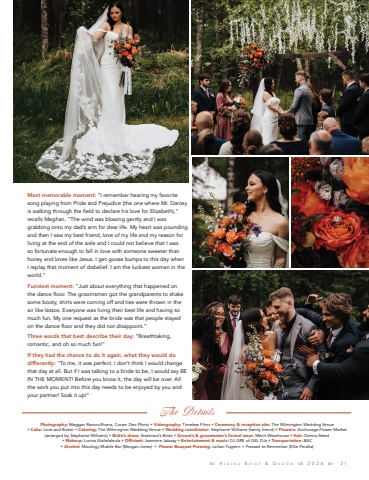 %uf098 A l a s k a B r i d e & G r o o m %uf099 2026 %uf098 2 1 The DetailsPhotography: Meggan Ramos-Rivera, Coram Deo Photo %u2022 Videography: Timeless Films %u2022 Ceremony & reception site: The Wilmington Wedding Venue%u2022 Cake: Love and Butter %u2022 Catering: The Wilmington Wedding Venue %u2022 Wedding coordinator: Stephanie Williams (family friend) %u2022 Flowers: Anchorage Flower Market (arranged by Stephanie Williams) %u2022 Bride%u2019s dress: Anderson%u2019s Bride %u2022 Groom%u2019s & groomsmen%u2019s formal wear: Men%u2019s Wearhouse %u2022 Hair: Donna Steed%u2022 Makeup: Lorina Alailefaleula %u2022 Officiant: Jeannine Jabaay %u2022 Entertainment & music: DJ GRE of GEL DJs %u2022 Transportation: BAC %u2022 Alcohol: Mixology Mobile Bar (Morgan Jones) %u2022 Flower Bouquet Pressing: Leilani Fugierri + Pressed to Remember (Ellie Peralta)Most memorable moment: %u201cI remember hearing my favorite song playing from Pride and Prejudice (the one where Mr. Darcey is walking through the field to declare his love for Elizabeth),%u201d recalls Meghan. %u201cThe wind was blowing gently and I was grabbing onto my dad%u2019s arm for dear life. My heart was pounding and then I saw my best friend, love of my life and my reason for living at the end of the aisle and I could not believe that I was so fortunate enough to fall in love with someone sweeter than honey and loves like Jesus. I get goose bumps to this day when I replay that moment of disbelief. I am the luckiest woman in the world.%u201dFunniest moment: %u201cJust about everything that happened on the dance floor. The groomsmen got the grandparents to shake some booty, shirts were coming off and ties were thrown in the air like lassos. Everyone was living their best life and having so much fun. My one request as the bride was that people stayed on the dance floor and they did not disappoint.%u201dThree words that best describe their day: %u201cBreathtaking, romantic, and oh so much fun!%u201dIf they had the chance to do it again, what they would do differently: %u201cTo me, it was perfect. I don%u2019t think I would change that day at all. But if I was talking to a bride to be, I would say BE IN THE MOMENT! Before you know it, the day will be over. All the work you put into this day needs to be enjoyed by you and your partner! Soak it up!%u201d