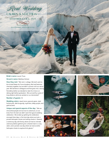 22 %uf098 A l a s k a B r i d e & G r o o m %uf099 2026Bride%u2019s name: Lauren TruaxGroom%u2019s name: Matthew SchererHow they met: %u201cWe met in college. We both went to the United States Air Force Academy. We had freshman chemistry together, but we didn%u2019t connect until our senior year. We started as colleagues and that grew into a strong friendship before we decided to take the chance on dating right before graduation. We survived four years of long distance while we worked on our doctorates!%u201dNumber of guests: 10Wedding colors: Jewel tones: peacock green, dark fuchsia pink, dark burgundy, royal blue, deep purple, and gold accentsUnique and special aspects of the day: %u201cWe are introverted people and we love to adventure, so we knew from the start we didn%u2019t want the typical wedding celebration. We ended up splitting the celebration amongst three days: a first look day where we took a private helicopter charter and sailing charter in Seward; a ceremony day with family where we had an intimate ceremony before gathering for a shared meal in a cozy cabin; and a private vow day where we took another helicopter charter to explore Knik glacier.%u201dReal WeddingLauren & MatthewSeptember 3,4 & 6, 2024Photography by Traci Edwards, Adventure & Vow