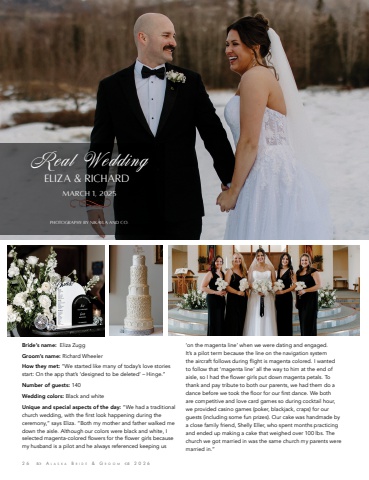 26 %uf098 A l a s k a B r i d e & G r o o m %uf099 2026Bride%u2019s name: Eliza ZuggGroom%u2019s name: Richard WheelerHow they met: %u201cWe started like many of today%u2019s love stories start: On the app that%u2019s %u2018designed to be deleted%u2019 %u2013 Hinge.%u201dNumber of guests: 140Wedding colors: Black and whiteUnique and special aspects of the day: %u201cWe had a traditional church wedding, with the first look happening during the ceremony,%u201d says Eliza. %u201cBoth my mother and father walked me down the aisle. Although our colors were black and white, I selected magenta-colored flowers for the flower girls because my husband is a pilot and he always referenced keeping us %u2018on the magenta line%u2019 when we were dating and engaged. It%u2019s a pilot term because the line on the navigation system the aircraft follows during flight is magenta colored. I wanted to follow that %u2018magenta line%u2019 all the way to him at the end of aisle, so I had the flower girls put down magenta petals. To thank and pay tribute to both our parents, we had them do a dance before we took the floor for our first dance. We both are competitive and love card games so during cocktail hour, we provided casino games (poker, blackjack, craps) for our guests (including some fun prizes). Our cake was handmade by a close family friend, Shelly Eller, who spent months practicing and ended up making a cake that weighed over 100 lbs. The church we got married in was the same church my parents were married in.%u201dReal WeddingEliza & RichardMarch 1, 2025Photography by Nikayla and Co.