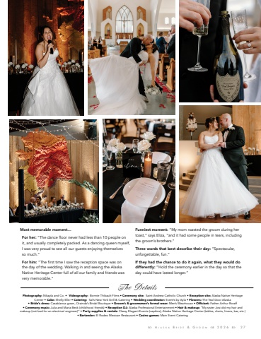 %uf098 A l a s k a B r i d e & G r o o m %uf099 2026 %uf098 2 7 The DetailsPhotography: Nikayla and Co. %u2022 Videography: Bonnie Thibault Films %u2022 Ceremony site: Saint Andrew Catholic Church %u2022 Reception site: Alaska Native HeritageCenter %u2022 Cake: Shelly Eller %u2022 Catering: Sal%u2019s New York Grill & Catering %u2022 Wedding coordinator: Event%u2019s by Ayla %u2022 Flowers: The Teal Door Alaska%u2022 Bride%u2019s dress: Casablanca gown, Orainda%u2019s Bridal Boutique %u2022 Groom%u2019s & groomsmen%u2019s formal wear: Men%u2019s Wearhouse %u2022 Officiant: Father Arthur Roraff %u2022 Ceremony music: Julia and Maria Beck (childhood friends) %u2022 Reception DJ: Alaska Professional Entertainment %u2022 Hair & makeup: %u201cMy sister Josi did my hair and makeup (not bad for an electrical engineer)%u201d %u2022 Party supplies & rentals: Classy Elegant Events (napkins); Alaska Native Heritage Center (tables, chairs, linens, bar, etc.) %u2022 Bartender: El Rodeo Mexican Restaurant %u2022 Casino games: Main Event CateringMost memorable moment%u2026For her: %u201cThe dance floor never had less than 10 people on it, and usually completely packed. As a dancing queen myself, I was very proud to see all our guests enjoying themselves so much.%u201dFor him: %u201cThe first time I saw the reception space was on the day of the wedding. Walking in and seeing the Alaska Native Heritage Center full of all our family and friends was very memorable.%u201dFunniest moment: %u201cMy mom roasted the groom during her toast,%u201d says Eliza, %u201cand it had some people in tears, including the groom%u2019s brothers.%u201dThree words that best describe their day: %u201cSpectacular, unforgettable, fun.%u201dIf they had the chance to do it again, what they would do differently: %u201cHold the ceremony earlier in the day so that the day could have lasted longer.%u201d