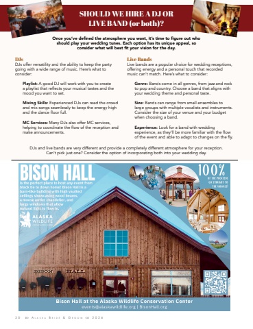 30 %uf098 A l a s k a B r i d e & G r o o m %uf099 2026DJsDJs offer versatility and the ability to keep the party going with a wide range of music. Here%u2019s what to consider:Playlist: A good DJ will work with you to create a playlist that reflects your musical tastes and the mood you want to set.Mixing Skills: Experienced DJs can read the crowd and mix songs seamlessly to keep the energy high and the dance floor full.MC Services: Many DJs also offer MC services, helping to coordinate the flow of the reception and make announcements.Live BandsLive bands are a popular choice for wedding receptions, offering energy and a personal touch that recorded music can%u2019t match. Here%u2019s what to consider:Genre: Bands come in all genres, from jazz and rock to pop and country. Choose a band that aligns with your wedding theme and personal taste.Size: Bands can range from small ensembles to large groups with multiple vocalists and instruments. Consider the size of your venue and your budget when choosing a band.Experience: Look for a band with wedding experience, as they%u2019ll be more familiar with the flow of the event and able to adapt to changes on the fly.SHOULD WE HIRE A DJ ORLIVE BAND (or both)?Once you%u2019ve defined the atmosphere you want, it%u2019s time to figure out who should play your wedding tunes. Each option has its unique appeal, so consider what will best fit your vision for the day. DJs and live bands are very different and provide a completely different atmosphere for your reception.Can%u2019t pick just one? Consider the option of incorporating both into your wedding day.