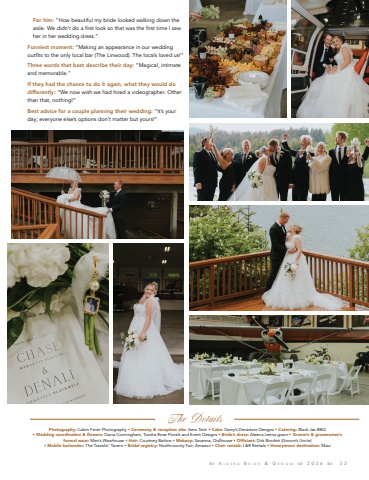 %uf098 A l a s k a B r i d e & G r o o m %uf099 2026 %uf098 3 3 The DetailsPhotography: Cabin Fever Photography %u2022 Ceremony & reception site: Aero Tech %u2022 Cake: Darcy%u2019s Decadent Designs %u2022 Catering: Black Jax BBQ %u2022 Wedding coordination & flowers: Dacia Cunningham, Tundra Rose Florals and Event Designs %u2022 Bride%u2019s dress: Aleena Leena gown %u2022 Groom%u2019s & groomsmen%u2019s formal wear: Men%u2019s Wearhouse %u2022 Hair: Courtney Barlow %u2022 Makeup: Savanna, Dollhouse %u2022 Officiant: Dirk Brodish (Groom%u2019s Uncle) %u2022 Mobile bartender: The Travelin%u2019 Tavern %u2022 Bridal registry: Northcountry Fair; Amazon %u2022 Chair rentals: L&R Rentals %u2022 Honeymoon destination: MauiFor him: %u201cHow beautiful my bride looked walking down the aisle. We didn%u2019t do a first look so that was the first time I saw her in her wedding dress.%u201dFunniest moment: %u201cMaking an appearance in our wedding outfits to the only local bar (The Linwood). The locals loved us!%u201dThree words that best describe their day: %u201cMagical, intimate and memorable.%u201dIf they had the chance to do it again, what they would do differently: %u201cWe now wish we had hired a videographer. Other than that, nothing!%u201dBest advice for a couple planning their wedding: %u201cIt%u2019s your day; everyone else%u2019s options don%u2019t matter but yours!%u201d