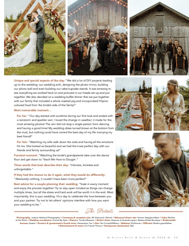%uf098 A l a s k a B r i d e & G r o o m %uf099 2026 %uf098 3 5 The DetailsPhotography: Joshua Veldstra Photography %u2022 Ceremony & reception site: AK Diamond J Ranch %u2022 Rehearsal dinner site: Homer Seaplane Base %u2022 Cake: Mother of the Bride %u2022 Wedding coordinator: Events By Ayla %u2022 Flowers: Tundra Blossom %u2022 Bride%u2019s dress: Essense of Australia gown, Bateau Bridal Boutique %u2022 Bridesmaids%u2019dresses: Azazie %u2022 Groom%u2019s & groomsmen%u2019s formal wear: Generation Tux %u2022 Hair: No CompHAIRison %u2022 Makeup: Dollhouse %u2022 Officiant: Bride%u2019s grandfather %u2022 Entertainment & music: DJ Fractal Theory %u2022 Honeymoon destination: BaliUnique and special aspects of the day: %u201cWe did a lot of DIY projects leading up to the wedding: our wedding arch, designing the photo mirror, building our photo wall and even building our cake/cupcake stands. It was amazing to see everything we worked hard on and pictured in our heads set up and put together. We also decided on a wedding buffet dinner that we put together with our family that included a whole roasted pig and incorporated Filipino cultured food from the bride%u2019s side of the family!%u201dMost memorable moment%u2026For her: %u201cOur day started with sunshine during our first look and ended with a rainstorm and sparkler exit. I loved the change in weather; it made for the most amazing photos! The rain did not stop a single person from dancing and having a good time! My wedding dress turned brown at the bottom from the mud, but nothing could have ruined the best day of my life marrying my best friend!%u201dFor him: %u201cWatching my wife walk down the aisle and having all the emotions hit me. She looked so beautiful and we had the most perfect day with our friends and family surrounding us!%u201dFunniest moment: %u201cWatching the bride%u2019s grandparents take over the dance floor and get down to %u2018Teach Me How to Dougie%u2019.%u201dThree words that best describe their day: %u201cIntimate, timeless and unforgettable.%u201dIf they had the chance to do it again, what they would do differently: %u201cAbsolutely nothing, it couldn%u2019t have been more perfect!%u201dBest advice for a couple planning their wedding: %u201cSoak in every moment and enjoy the process together! Try to stay open minded as things can change multiple times, but all the stress and hard work will be worth it in the end. Most importantly, this is your wedding. It%u2019s a day to celebrate the love between you and your partner. Try not to let others%u2019 opinions interfere with how you want your wedding to be.%u201d