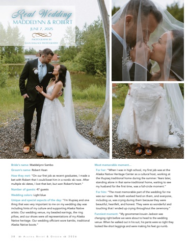 38 %uf098 A l a s k a B r i d e & G r o o m %uf099 2026Bride%u2019s name: Maddelynn SamboGroom%u2019s name: Robert HaanHow they met: %u201cOn our first job as recent graduates, I made a bet with Robert that I could beat him in a nordic ski race. After multiple ski dates, I lost that bet, but won Robert%u2019s heart.%u201dNumber of guests: 47 guestsWedding colors: Light blueUnique and special aspects of the day: %u201cI%u2019m I%u00f1upiaq and one thing that was very important to me on my wedding day was including hints of my culture and supporting Alaska Native artists. Our wedding venue, my beaded earrings, the ring pillow, and our shoes were all representations of my Alaska Native heritage. Our wedding officiant wore kamiks, traditional Alaska Native boots.%u201dMost memorable moment%u2026For her: %u201cWhen I was in high school, my first job was at the Alaska Native Heritage Center as a cultural host, working at the I%u00f1upiaq traditional home during the summer. Years later, standing alone in that same traditional home, waiting to see my husband for the first time, was a full-circle moment.%u201dFor him: %u201cThe most memorable part of the wedding for me was our vows. We both worked hard on them, and everyone, including us, was crying during them because they were beautiful, heartfelt, and honest. They were so wonderful and touching that I ended up crying throughout the ceremony.%u201dFunniest moment: %u201cMy groomsman/cousin Jackson was changing right before we were about to head to the wedding venue. When he walked out in his suit, his pants were so tight they looked like short leggings and were making his feet go numb. Real WeddingMaddelynn & RobertJune 7, 2025Photography byJulia Wallace Photography