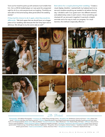 %uf098 A l a s k a B r i d e & G r o o m %uf099 2026 %uf098 3 9 The DetailsPhotography: Julia Wallace Photography %u2022 Ceremony site: Alaska Native Heritage Center %u2022 Reception site: Athabascan Ceremonial House %u2022 Cake: Alaska Cake Studio %u2022 Catering: Sal%u2019s New York Catering and Grill %u2022 Flowers: Alaska Wholesale Flower Market (bridal party bouquets); Midvalley Greenhouse and Fresh Starts Farms, LLC (hanging baskets); Bride%u2019s dress: Wtoo by Watters %u2022 Groom%u2019s formal wear: Men%u2019s Wearhouse %u2022 Hair: Rachel Halley, Drift Salon %u2022 Officiant: Steve Chronic (Groom%u2019s step-grandfather) %u2022 Bride%u2019s & groom%u2019s slippers: Angela %u0141ot%u2019oydaatlno Gonzalez %u2022 Reception centerpieces (decorative gourds): Cassie Chronic (Groom%u2019s grandmother) %u2022 Bridal earrings: Cherish Nearuk Maureen Engebretsen %u2022 Ring pillo Gloria Cunningham, Glorias Creations %u2022 Sweetheart tablecloth: Esther N. Gage (Bride%u2019s grandmother) %u2022 Guest accommodations: Airbnb, Downtown Hilton %u2022 Honeymoon destination: Girdwood / Alyeska Nordic SpaTurns out he mixed his pants up with someone much smaller than him. He is a 250-lb football player so it was quite the unexpected sight for all of us, and everyone burst out laughing. Thankfully we were able to find some backup dress pants before the wedding started.%u201dIf they had the chance to do it again, what they would do differently: %u201cWe both agree that we should have cut a bigger piece of our wedding cake because the Earl Grey layer was so delicious. We did get to try the carrot cake as well!%u201dBest advice for a couple planning their wedding: %u201cCreate a visual display checklist. I wanted both my husband and me to see and visualize everything we needed to do before the big day. I divided a wall in our guest room into different sections and added sticky notes in each column. Once something was checked off, we removed it together! It was both a helpful reminder and a fun way to track our progress. For visual learners, this method is especially effective.%u201d
