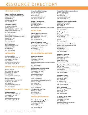 40 %uf098 A l a s k a B r i d e & G r o o m %uf099 2026RESOURCE DIRECTORYACCOMMODATIONS Aurora Guesthouse & Gardens Base of Hatcher Pass (Palmer side)Wasilla, AK 99654907-746-4181www.cateralaska.comSee ad on page 7Land%u2019s End Resort4786 Homer Spit Rd.Homer, AK 99603907-235-0400 or 800-478-0400www.lands-end-resort.comSee ad on page 29Lexi%u2019s GuesthouseAirbnb Listing 55868965492634983Wasilla, AK 99654907-242-4147See ad on page 6Lexi%u2019s LakehouseAirbnb Listing 40307400Wasilla, AK 99654907-242-4147See ad on page 6ALTERATIONSAnderson%u2019s Bride510 W. Tudor Blvd., Ste. 2Anchorage, AK 99503907-563-8839www.andersonsbride.comSee ads on pages 24, 31BEAUTY, HEALTH & FITNESSCapital Fitness5121 Arctic Blvd., Unit CAnchorage, AK 99503907-302-7028www.capitalfitnessnow.comEncore Esthetics4050 Lake Otis Pkwy., Ste. 100Anchorage, AK 99508907-865-6944www.encoreesthetics.comSee ad on page 5BRIDAL APPAREL & ACCESSORIESAnderson%u2019s Bride510 W. Tudor Blvd., Ste. 2Anchorage, AK 99503907-563-8839www.andersonsbride.comSee ads on pages 24, 31Arctic Rose Bridal Boutique1380 N Bloodstone Cir.Wasilla, AK 99654907-376-3180www.arcticrosebridal.comSee ads on pages 6, 44Audrey%u2019s Womenswear1005 Cushman St.Fairbanks, AK 99701907-456-5831www.franksmenswearalaska.com/audreysBRIDAL FAIRSInterior Wedding ShowcaseMarch 8, 2026, 11 am-3 pmWestmark Hotel, Fairbanks907-458-1801See ad on page 252026 Fall Wedding Show Presented by Alaska Bride & GroomOctober 4, 2026, Noon-5 pmAlaska Airlines Center907-868-9050www.alaskabride.comBRIDAL SHOWERS & PARTIESAnchorage Museum 625 C St.Anchorage, AK 99501907-929-9249www.anchoragemuseum.org/visit/museumrentalsSee ad on page 9Alaska Native Heritage Center8800 Heritage Center Dr.Anchorage, AK 99504907-330-8000www.alaskanative.net See ad on page 19Lexi%u2019s GuesthouseAirbnb Listing 55868965492634983Wasilla, AK 99654907-242-4147See ad on page 6Lexi%u2019s LakehouseAirbnb Listing 40307400Wasilla, AK 99654907-242-4147See ad on page 6CEREMONY LOCATIONSAlaska Native Heritage Center8800 Heritage Center Dr.Anchorage, AK 99504907-330-8000www.alaskanative.net See ad on page 19Alaska Wildlife Conservation CenterMile 79 Seward Hwy.Portage, AK 99587907-783-0058www.alaskawildlife.orgSee ad on page 30Alpenglow Lodge at Arctic Valley18800 Arctic Valley Rd.Anchorage, AK 99505907-792-9091www.arcticvalley.org/weddingsSee ad on page 9Anchorage Museum 625 C St.Anchorage, AK 99501907-929-9249www.anchoragemuseum.org/visit/museumrentalsSee ad on page 9Aurora Guesthouse & GardensBase of Hatcher Pass (Palmer side)Wasilla, AK 99654907-746-4181www.cateralaska.comSee ad on page 7Bayshore Clubhouse3131 Amber Bay Lp.Anchorage, AK 99515907-522-4910www.bayshore.clubSee ad on page 13Dena%u2019ina Civic and Convention Centers600 7th Ave.Anchorage, AK 99501907-263-2850www.anchorageconventioncenters.comSee ad on page 4Land%u2019s End Resort4786 Homer Spit Rd.Homer, AK 99603907-235-0400or 800-478-0400www.lands-end-resort.comSee ad on page 29Lexi%u2019s LakehouseAirbnb Listing 40307400Wasilla, AK 99654907-242-4147See ad on page 6O%u2019Malley%u2019s on the Green3651 O%u2019Malley Rd.Anchorage, AK 99507907-522-3324www.anchoragegolfcourse.comSee ad on page 37