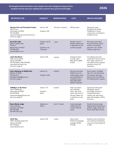 %uf098 A l a s k a B r i d e & G r o o m %uf099 2026 %uf098 4 3 RECEPTION SITE CAPACITY RESERVATIONS COST SPECIAL FEATURESDena%u2019ina Civic and Convention Centers600 7th Ave.Anchorage, AK 99501907-263-2850www.anchorageconventioncenters.comSee ad on page 4Indoors: 300Outdoors: 250One year in advance $44 per guest. Spectacular views throughout the facility. Professional in-house culinary team committed to excellent service.Inn at Tern LakeMile 36, Seward Hwy.PO Box 7Moose Pass, AK 99631907-288-3667www.ternlakeinn.comIndoors: max 58 guestsOutdoors: max 120 guests1 year Site fee minimum $2,500; catering cost is dependent on the number of guests.Nine acres surrounded by national forest, ponds, streams, mountainous panoramic view, 30-foot ceiling in great room.Land%u2019s End Resort4786 Homer Spit Rd.Homer, AK 99603907-235-0400 or 800-478-0400www.lands-end-resort.comSee ad on page 29Indoors: 200 Anytime Average sit-down 3-course meal: $50; site fee: $850-$1,500.Full catering and event coordination services, dance floor, stage, outdoor hot tub, beach access, exquisite panoramic views, A/V equipment.Lexi%u2019s Lakehouse on Wasilla LakeWasilla, AK 99654907-242-4147lexislakehouseak@gmail.comSee ad on page 6Indoors: 30Outdoors: 100+Anytime Minimum site rental $5,400 covers two nights lodging, event and cleaning fee for 6-bedroom home. Refundable $500 deposit is separate.Event location on Wasilla lake with a full deck facing the Chugach Mountains. Spacious accommodations for wedding party or guests.O%u2019Malley%u2019s on the Green3651 O%u2019Malley Rd.Anchorage, AK 99507907-522-3324www.anchoragegolfcourse.comSee ad on page 37Indoors: 170Outdoors: VariesAnytime Rates vary based upon selected venue, day of the week, and month of the year. Please call or email for our rate sheet.Spectacular setting with 360-degree view of Anchorage, Denali and Chugach Mountains, catering, bar, dance floor, deck, sound system, HDTVs and more.Raven Glacier LodgeCrow Creek Rd.Girdwood, AK 99587907-783-2636907-980-1997 (cell)Depends on seasonUp to 1 %u00bd years Custom packages created with you. Contact Cathy for quote.Private full-service lodge. Magical glacier-fed grounds, gardens, lodge, decks and house-made feasts of food.Veil & Vine4900 S Bodenburg Spur Rd.Palmer, AK 99645907-795-8870www.veilandvine.comIndoors: 250 2 years Venue rental: $3,500; full packages available: $7,500-$13,500.Beautiful venue architecture surrounded by breathtaking views and all that Alaska has to offer.The Reception Guide lists Alaska%u2019s top reception sites and is designed to help you find a reception site that suits your wedding style, personal taste, guest list and budget. 2026