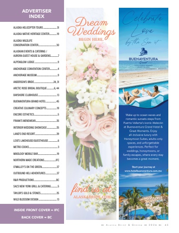 %uf098 A l a s k a B r i d e & G r o o m %uf099 2026 %uf098 4 5 INSIDE FRONT COVER = IFC BACK COVER = BCADVERTISERINDEXALASKA HELICOPTER TOURS .............................31ALASKA NATIVE HERITAGE CENTER................19ALASKA WILDLIFE CONSERVATION CENTER.......................................30ALASKAN EVENTS & CATERING /AURORA GUEST HOUSE & GARDENS................7ALPENGLOW LODGE ..................................................9ANCHORAGE CONVENTION CENTER.................4ANCHORAGE MUSEUM.............................................9ANDERSON%u2019S BRIDE..........................................24, 31ARCTIC ROSE BRIDAL BOUTIQUE...............6, 44BAYSHORE CLUBHOUSE ........................................ 13BUENAVENTURA GRAND HOTEL......................45CREATIVE CULINARY CONCEPTS......................19ENCORE ESTHETICS...................................................5FRANK%u2019S MENSWEAR.............................................25INTERIOR WEDDING SHOWCASE ....................25LAND%u2019S END RESORT..............................................29LEXI%u2019S LAKEHOUSE/GUESTHOUSE ....................6METRO COOKS ..............................................................3MIXOLOGY MOBILE BAR.........................................19NORTHERN MADE CREATIONS.........................IFCO%u2019MALLEY%u2019S ON THE GREEN................................37OUTBOUND HELI ADVENTURES ........................37R&R PRODUCTIONS ................................................BCSAL%u2019S NEW YORK GRILL & CATERING ..............5TAYLOR%u2019S GOLD & STONES..................................25WILD BLOSSOM DESIGN ....................................... 13
