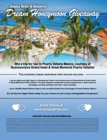 46 %uf098 A l a s k a B r i d e & G r o o m %uf099 2026Win a trip for two to Puerto Vallarta Mexico, courtesy ofBuenaventura Grand Hotel & Great Moments Puerto Vallarta!%u2022 Seven nights and eight days in a Honeymoon Suite in all-inclusive plan at Buenaventura Grand Hotel & Great Moments Puerto Vallarta. This plan features exceptional culinary experiences, a wide variety of beverages, exciting activities, and more. Taxes included.%u2022 Up to 100,000 Alaska Airlines miles or two roundtrip tickets from Anchorage to Puerto Vallarta, MexicoSo, let the fun begin! Enter today for your chance to win a truly unforgettable honeymoon!CONTEST RULES AND INFORMATIONThis incredible dream honeymoon prize package includes:Alaska Bride & Groom%u2019sDream Honeymoon GiveawayNo purchase necessary. Contest is open to Alaska residents 18 years and older, except employees or contractors of Alaska Life Publishing LLC (publisher of Alaska Bride & Groom) or Buenaventura Grand Hotel & Great Moments. The drawing will be at the 2026 Fall Wedding Show at The Alaska Airlines Center, October 4, 2026. Prize cannot be transferred or redeemed for cash. Alaska Life Publishing LLC is not responsible for lost or misdirected entries. The odds of winning this contest are determined by the number of entries received. Limit one entry per person. *One winner will receive up to 100,000 Alaska Airlines mileage plan miles (or 2 round-trip tickets from Anchorage to Puerto Vallarta), eight days and seven nights%u2019 accommodations in a Honeymoon Suite at Buenaventura Grand Hotel & Great Moments Puerto Vallarta. Blackout dates include the following holidays: Christmas, New Year%u2019s Eve, President%u2019s week, and Easter week. Some restrictions may apply. Not valid during December 20, 2026 to January 2, 2027, or March 24 to April 6. 2027. This certificate cannot be transferred or traded. Airline passengers are responsible for any additional airfare costs, plus applicable taxes, fees or surcharges. Upgrades or difference in meals, accommodations and sightseeing tours are the responsibility of the winner. Travel must be completed by December 19, 2027. Hotel and airline space subject to availability. Travel must be booked 90 days in advance (or additional costs may be incurred) and earlier planning is recommended to ensure the best availability. By accepting prize, winner agrees that Alaska Life Publishing LLC, the Buenaventura Grand Hotel & Great Moments Puerto Vallarta, their partnerships, subsidiaries and affiliates and each of such entities%u2019 respective officers, directors, agents and employees are not responsible or liable for any injury, loss, illness, litigation or damage that may occur from participation in the promotion or acceptance, possession, use or misuse of prizes.Enter Online at www.AlaskaBride.com