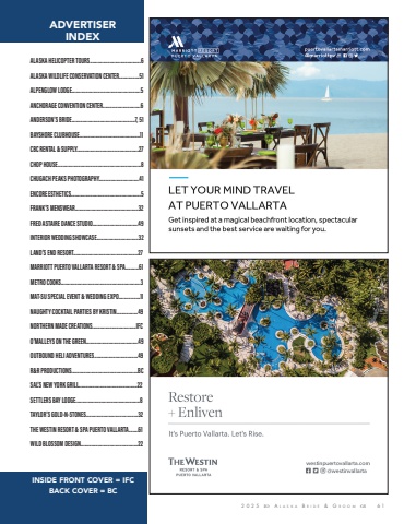 2025 A l a s k a B r i d e & G r o o m 6 1 INSIDE FRONT COVER = IFC BACK COVER = BCADVERTISERINDEXALASKA HELICOPTER TOURS......................................6 ALASKA WILDLIFE CONSERVATION CENTER...............51 ALPENGLOW LODGE...................................................5 ANCHORAGE CONVENTION CENTER............................6 ANDERSON’S BRIDE...............................................7, 51 BAYSHORE CLUBHOUSE.............................................11CBC RENTAL & SUPPLY..............................................27CHOP HOUSE..............................................................8 CHUGACH PEAKS PHOTOGRAPHY..............................41ENCORE ESTHETICS....................................................5 FRANK’S MENSWEAR...............................................32FRED ASTAIRE DANCE STUDIO..................................49INTERIOR WEDDING SHOWCASE...............................32 LAND’S END RESORT................................................27MARRIOTT PUERTO VALLARTA RESORT & SPA..........61 METRO COOKS...........................................................3MAT-SU SPECIAL EVENT & WEDDING EXPO................11 NAUGHTY COCKTAIL PARTIES BY KRISTIN................49NORTHERN MADE CREATIONS.................................IFC O’MALLEYS ON THE GREEN.......................................49OUTBOUND HELI ADVENTURES.................................49R&R PRODUCTIONS..................................................BCSAL’S NEW YORK GRILL............................................22 SETTLERS BAY LODGE................................................8TAYLOR’S GOLD-N-STONES.......................................32THE WESTIN RESORT & SPA PUERTO VALLARTA.......61WILD BLOSSOM DESIGN...........................................22
