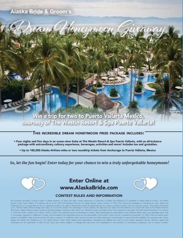 Alaska Bride & Groom’sDream Honeymoon GiveawayWin a trip for two to Puerto Vallarta Mexico,courtesy of The Westin Resort & Spa Puerto Vallarta!So, let the fun begin! Enter today for your chance to win a truly unforgettable honeymoon!• Four nights and five days in an ocean-view Suite at The Westin Resort & Spa Puerto Vallarta, with an all-inclusive package with extraordinary culinary experience, beverages, activities and more! Includes tax and gratuities.• Up to 100,000 Alaska Airlines miles or two roundtrip tickets from Anchorage to Puerto Vallarta, MexicoCONTEST RULES AND INFORMATIONThis incredible dream honeymoon prize package includes:No purchase necessary. Contest is open to Alaska residents 18 years and older, except employees or contractors of Alaska Life Publishing LLC (publisher of Alaska Bride & Groom), The Westin Resort & Spa Puerto Vallarta. The drawing will be at the 2025 Fall Wedding Show at The Alaska Airlines Center, October 5, 2025. Prize cannot be transferred or redeemed for cash. Alaska Life Publishing LLC is not responsible for lost or misdirected entries. The odds of winning this contest are determined by the number of entries received. Limit one entry per person. *One winner will receive up to 100,000 Alaska Airlines mileage plan miles (or 2 round-trip tickets from Anchorage to Puerto Vallarta), five days and four nights’ accommodations in an ocean-view suite at The Westin Resort & Spa Puerto Vallarta. Blackout dates include the following holidays: Christmas, New Year’s Eve, President’s week, and Easter week. Some restrictions may apply. Not valid during December 20 to January 2, 2025 and 2026, or March 24 to April 6, 2025 or 2026. This certificate cannot be transferred or traded. Airline passengers are responsible for any additional airfare costs, plus applicable taxes, fees or surcharges. Upgrades or difference in meals, accommodations and sightseeing tours are the responsibility of the winner. Travel must be completed by December 19, 2026. Hotel and airline space subject to availability. Travel must be booked 90 days in advance (or additional costs may be incurred) and earlier planning is recommended to ensure the best availability. By accepting prize, winner agrees that Alaska Life Publishing LLC, The Westin Resort & Spa Puerto Vallarta, their partnerships, subsidiaries and affiliates and each of such entities’ respective officers, directors, agents and employees are not responsible or liable for any injury, loss, illness, litigation or damage that may occur from participation in the promotion or acceptance, possession, use or misuse of prizes.Enter Online at www.AlaskaBride.com