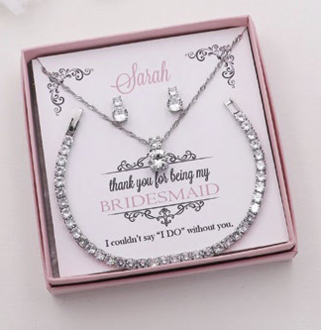 Looking for bridal party gifts? Jewelry is such a classic choice that you can’t gowrong. Getting all your ladies matching necklaces, bracelets or earrings (or all of the above!) is a special way to commemorate their important roles – and give them jewelry they can wear on your wedding day. These pretty Bridesmaid Jewelry Sets from Allure Wedding Jewelry feature cubic zirconia in a sparkling and minimalist style. Choose from silver, gold or rose gold. Each set comes on a custom, personalized jewelry card featuring your choice for the name, title, font color and box color. Visit allureweddingjewelry.com.