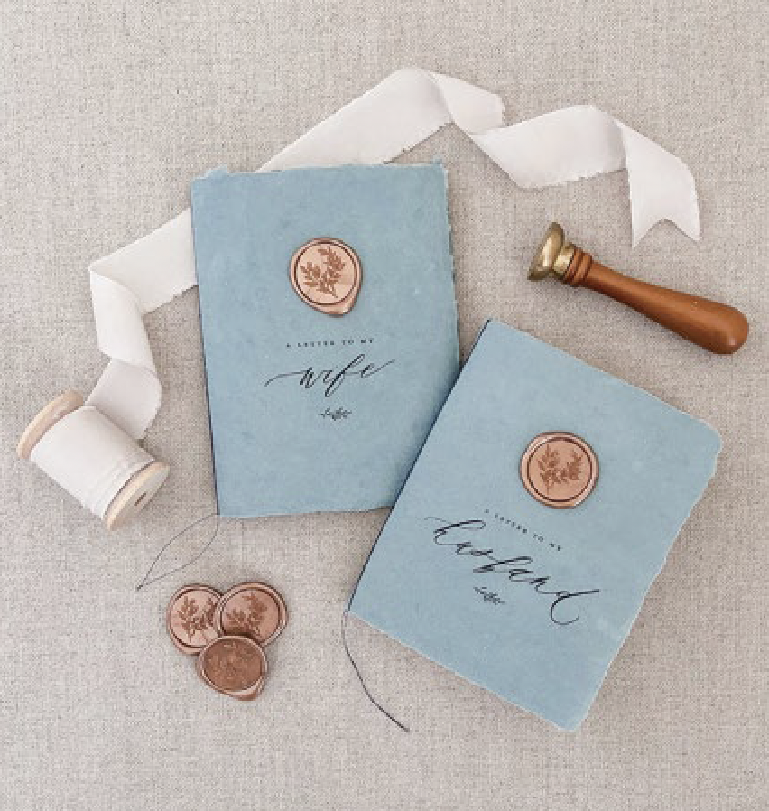 Say ‘I do’ with your written vows held in your hand, a keepsake to treasure. These beautiful His and Hers vow books feature handmade paper (in blue or ivory) with a wax seal embellishment for a romantic and ethereal vibe. The two books in the set − “A letter to my husband” and “A letter to my wife” – are each filled with unlined pages in a natural color for writing vows, bound with navy thread. Dimensions are 4.25” x 5.5” when closed. Visit jensimpsondesign.com.
