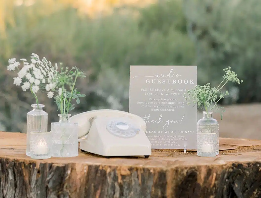 Elevate your wedding guest experience with The Audio Guestbook in the form of a vintage rotary phone that lets your guests record message clips all night long. It’s easy: Simply pick up the phone, wait for the beep, say what’s on your mind, and hang up (no phone line necessary!). All the recordings will be uploaded after your event for you to listen/share/download and cherish for years to come. Choose your phone rental from several different color options. After sending back the phone (with the prepaid return label), the company processes your messages into a digital download, USB, or vinyl record keepsake for memories you can replay forever. Visit theaudioguestbook.co.